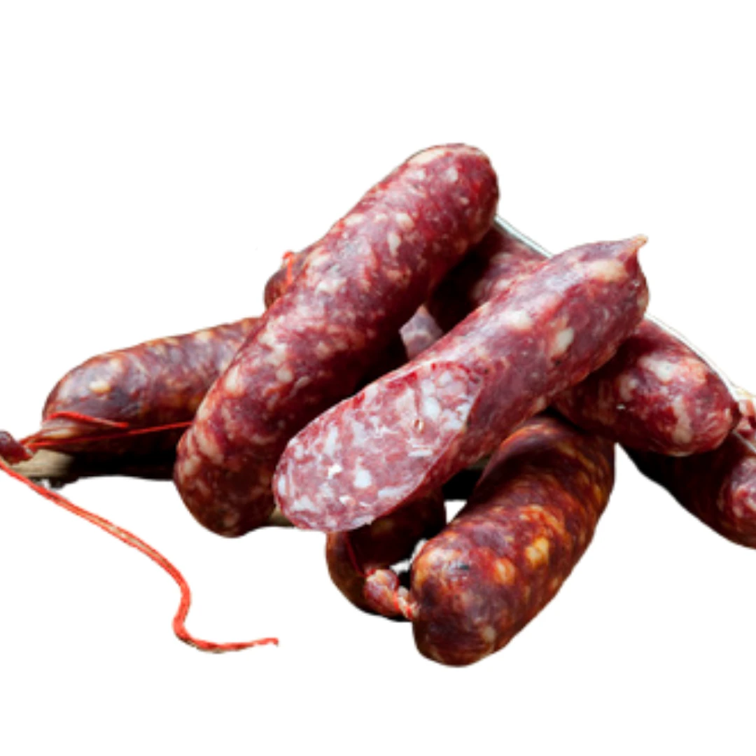 Product Info:Â They are a small salami, with course minced pork and beef meat. The meat mixture is filled into a natural casing. Hot cacciatori contain a medium heat strength chilli.
