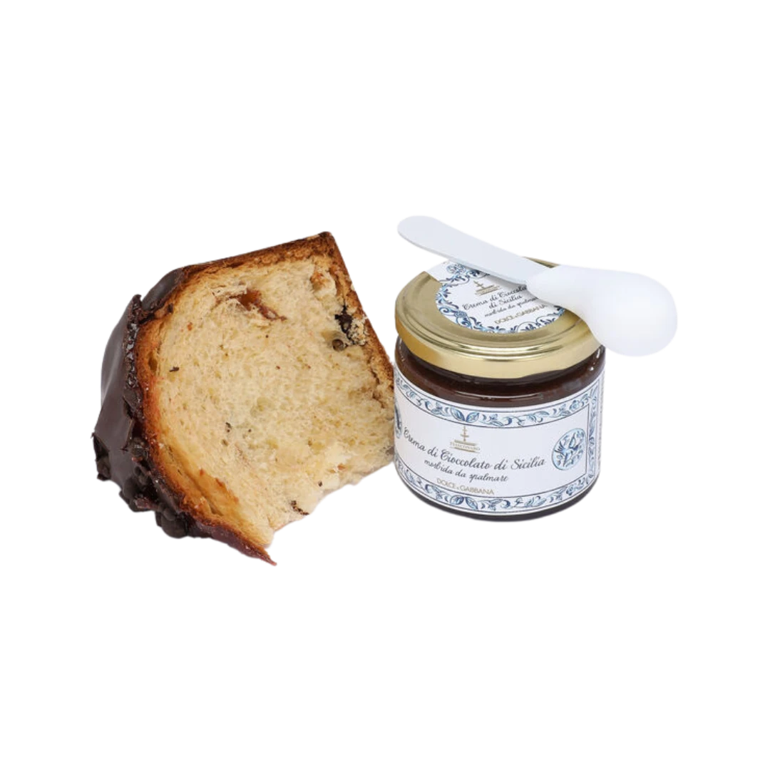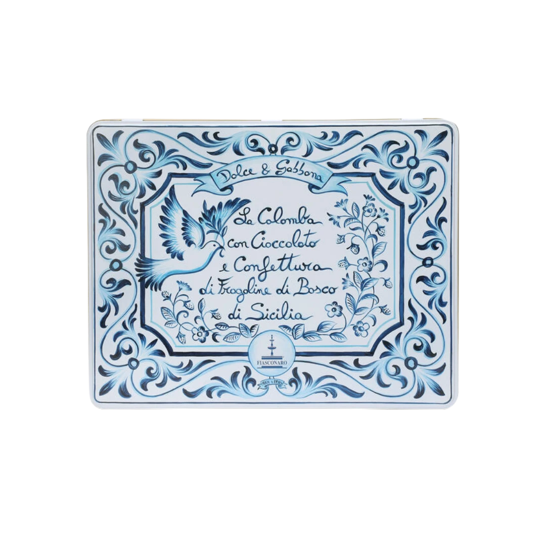 Product: Colomba coated in Sicilian chocolate with a wild strawberry jam throughout in a Dolce & Gabbana designed tin. Additional jar of strawberry jam on the side.Â