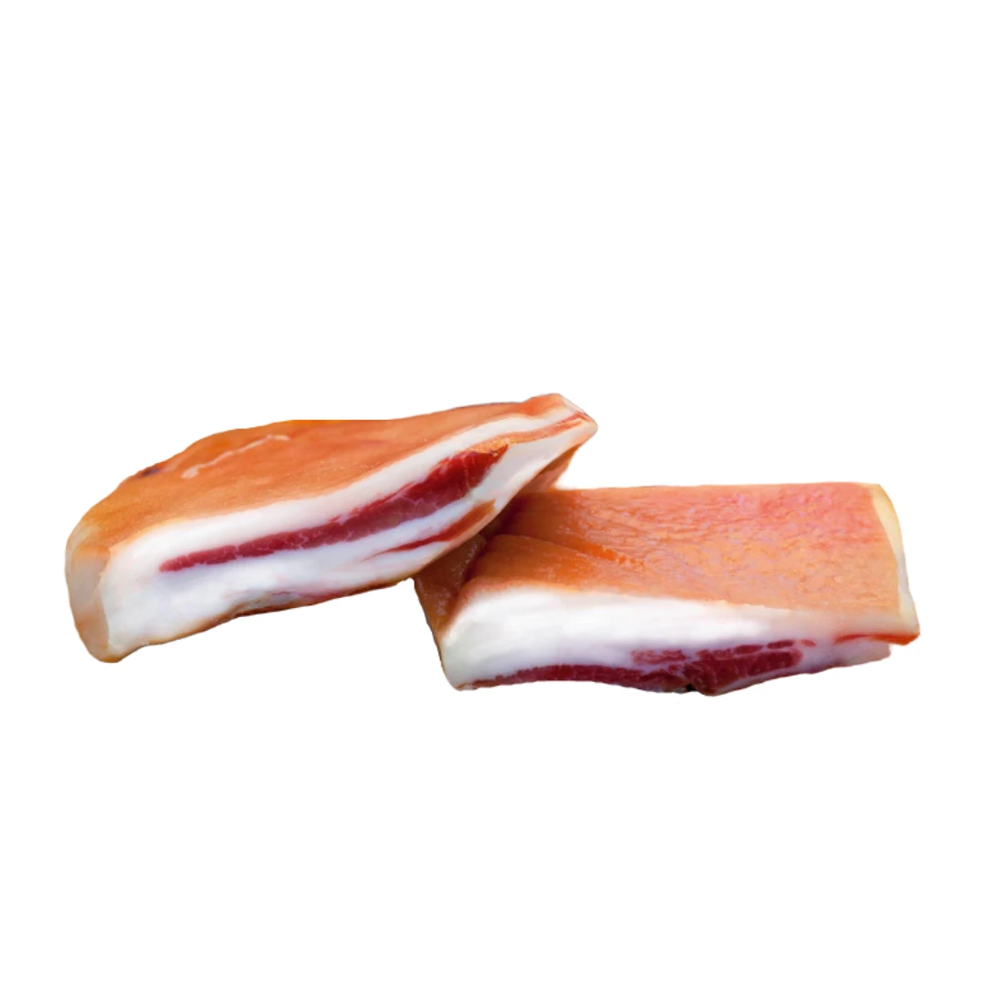 Product Info: Guanciale is prepared from pork jowl or cheeks. Pork cheek is rubbed with salt, and spices and cured for 3-5 weeks or until it loses approximately 30% of its original weight. Its flavour is stronger than other pork products, such as pancetta, and its texture is more delicate.