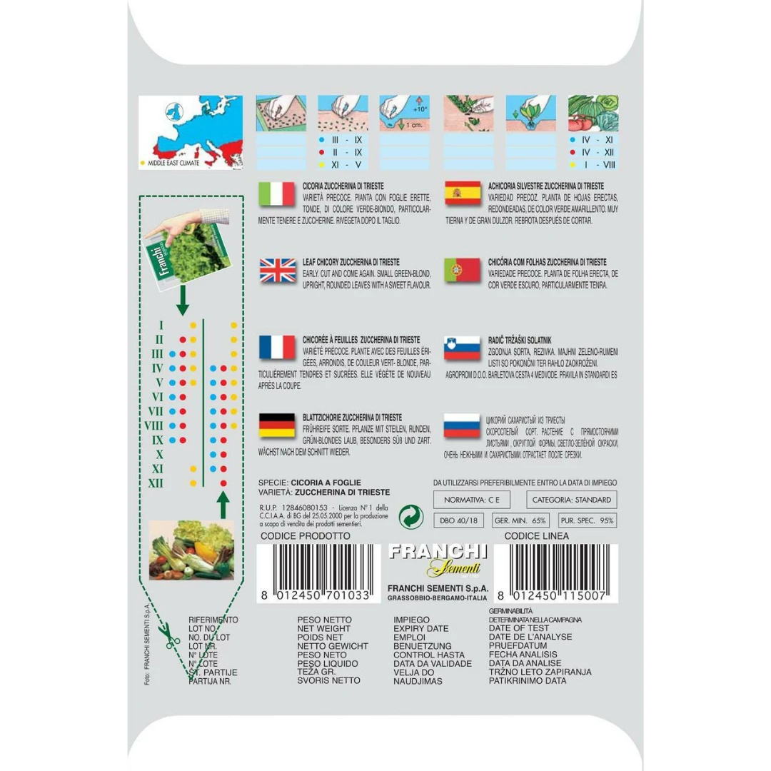 Product Description:Â These are the plant seeds of small, sweet chicory from Trieste with rounded, upright, light green leaves with almost no ribbing and very thin stems.